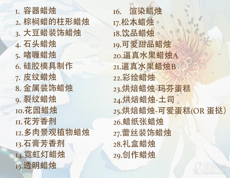 课程内容:包含29种蜡烛、石膏,硅胶模具制作的专业蜡烛课程,课后获得CLAB协会的讲师资格证书