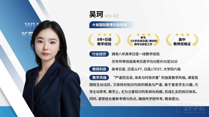 行业经历:拥有八年高考日语一线教学经验、历年所带班级高考日语平均分提升35至50分