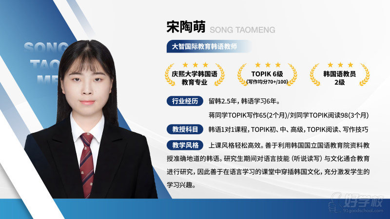 行业经历:韩语教学4年+,多次前往韩国高等学府,参与深度进修与学术交流