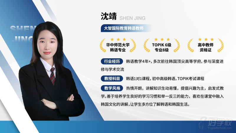 教学风格:课堂活泼开朗,平易近人,课堂氛围活跃。擅长借助韩国流行文化元素激发学生学习韩语的兴趣,并注重在听说、读、写四个方面培养学生的均衡语言能力。重视韩语口语的实际运用,更自然地融入韩语学习环境。