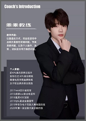 个人荣誉:前 KPL 俱乐部青训选手;曾担任过 KPL 青训教练、森海电竞学院教练、女子职业俱乐部主教练;2017nest 四川省头名;2018 成都 koc 职业场亚军;2018 重庆 KOC头名;2019SJSL 星途全国亚军;2019 年华为电子竞技大赛全国四强;2020 年第一届全国大赛全国四强。