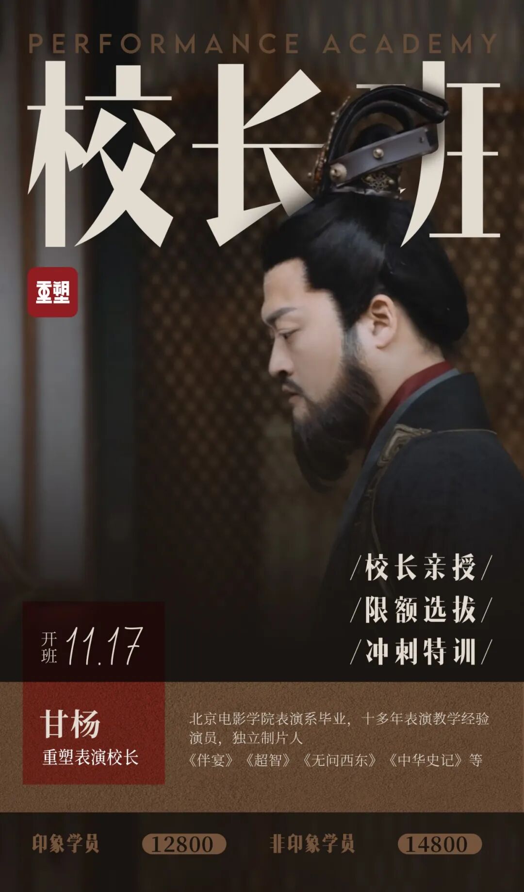 本次校长班由印象表演学院校长全程亲授,他不仅是毕业于北京电影学院的表演教师,现役演员和独立制片人,更是多年一线艺考方向的把握者。从教学理念到考场动态,从审美建构到应试技巧,甘校将带领学员直击艺考核心。