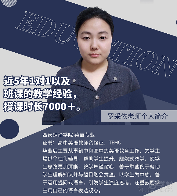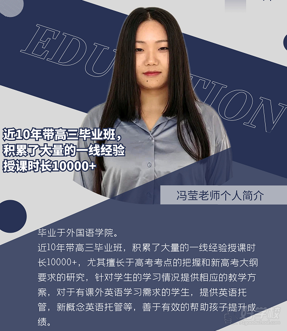 毕业于外国语学院。近10年带高三毕业班,积累了大量的一线经验授课时长10000+,尤其擅长于高考考点的把握和新高考大纲要求的研究,针对学生的学习情况提供相应的教学方案,对于有课外英语学习需求的学生,提供英语托管,新概念英语托管等,善于有效的帮助孩子提升成绩。