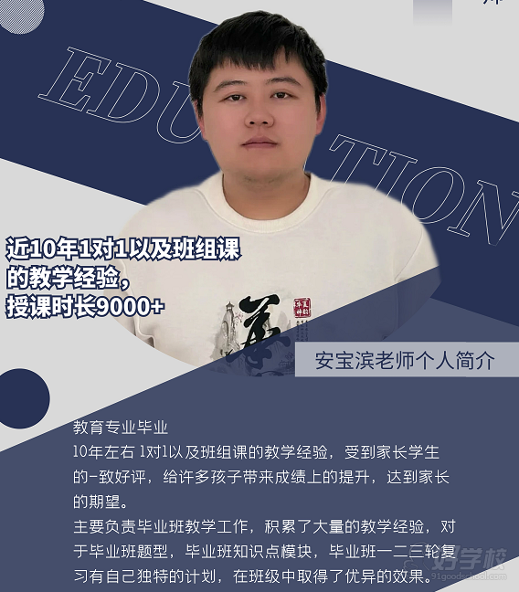 2009年开始进行教育教学工作,英语押题组组长,主攻初高英语,连续带过十几届初高三毕业班,成绩提升明显。丰富的教学经验和风趣的课堂收到所有学生和家长的好评,常年带出提升巨大的学生,押中题型押中考点不尽其数,多名学生因为张老师考上理想的学校。