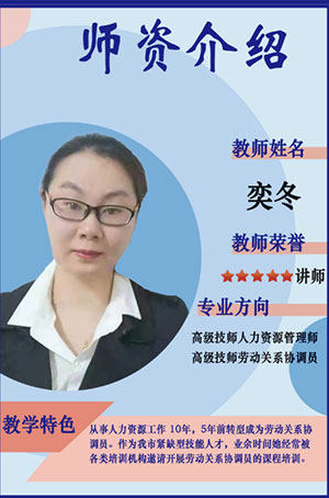 教学特色:从事人力资源工作10年,5年前转型成为劳动关系协调员。作为我市紧缺型技能人才,业余时间她经常被各类培训机构邀请开展劳动关系协调员的课程培训。