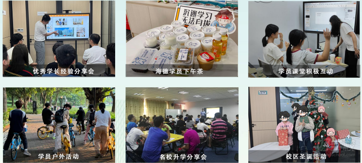 开设优秀学长经验分享会、名校升学分享会,举办学员下午茶、校区圣诞活动、户外拓展活动等,打造互动式学习氛围。